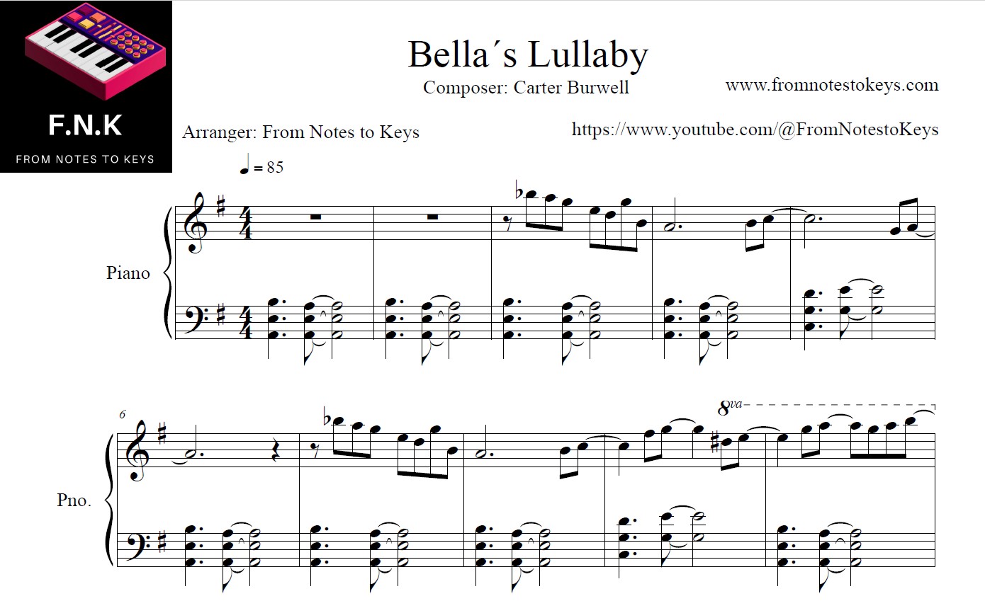Experience the captivating elegance of Bella’s Lullaby from Twilight, composed by Carter Burwell, with our exclusive piano sheet music arrangement. This beautifully crafted score is designed for pianists of all levels, capturing the emotion and magic of the iconic film. Whether you’re revisiting a timeless classic or discovering it for the first time, our sheet music will guide you through every delicate note. Purchase your copy today and elevate your piano repertoire!